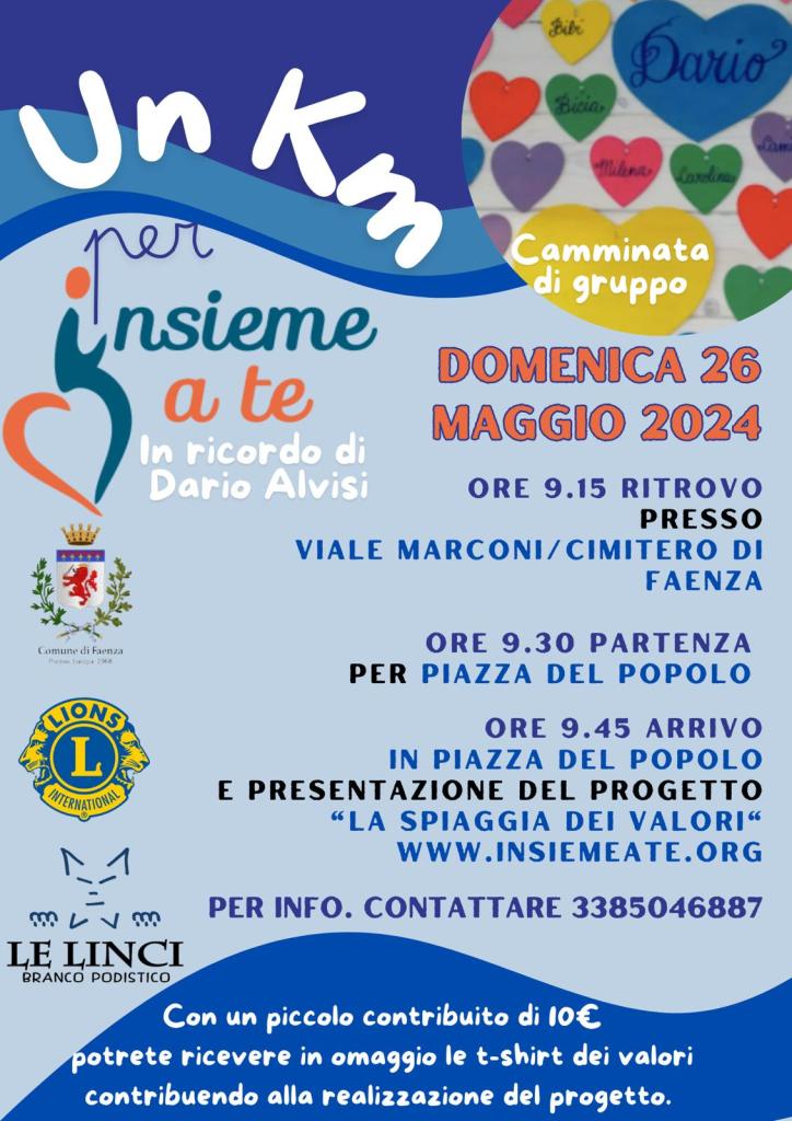 Come 6 anni fa e in compagnia dei Lions di Faenza, collaboreremo per la buona riuscita di questa marcia il cui devoluto sarà interamente destinato alla Spiaggia dei Valori (https://www.insiemeate.org/).