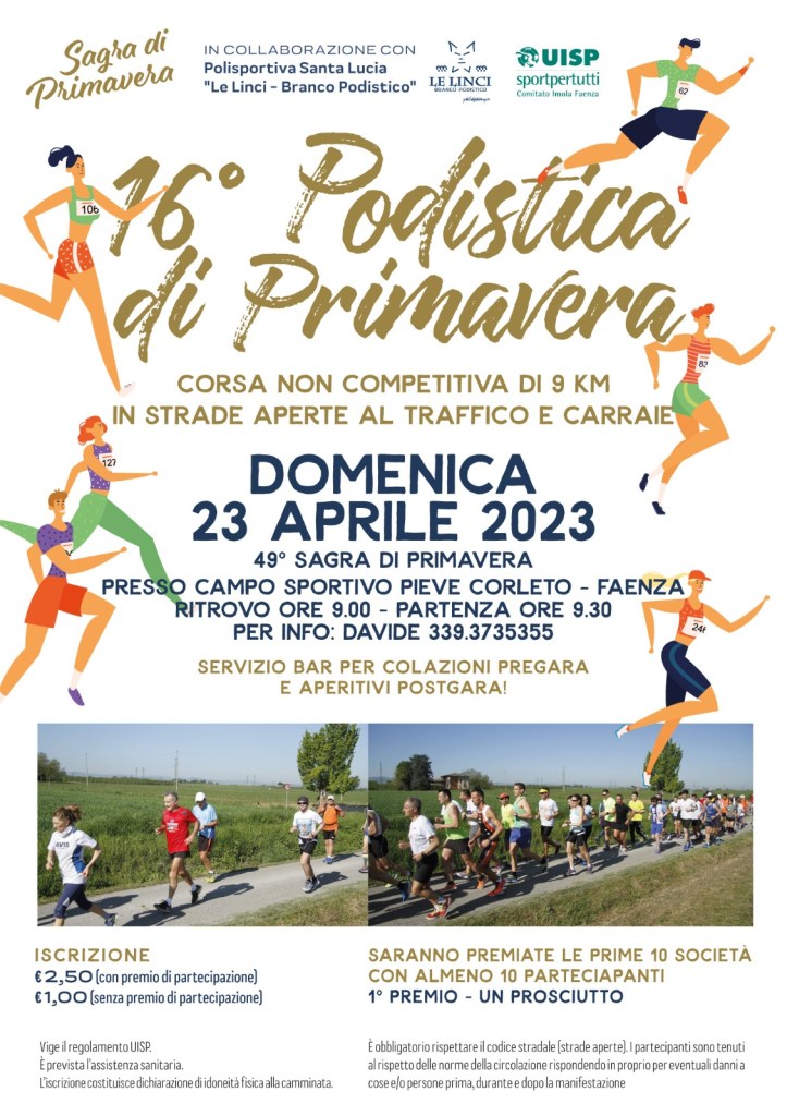 5 aprile 2023 by lynxlynx2012 - 0 commenti Podistica di Primavera 2023 Rinnovata la collaborazione tra la Sagra di Primavera a Pieve Corleto e le Linci! domenica 23 aprile tutti alla podistica di Primavera! grr grr grr Condividi: Fai clic per condividere su Facebook (Si apre in una nuova finestra) Facebook Fai clic qui per stampare (Si apre in una nuova finestra) Stampa Fai clic per condividere su X (Si apre in una nuova finestra) X Mi piace Caricamento...